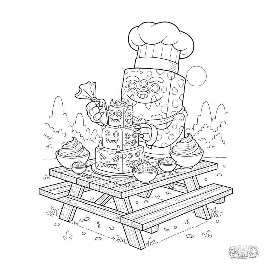 Página para colorear detallada para 10-12 años: un monstruo cuadrado con gorro de chef decora un pastel festivo en un picnic.
