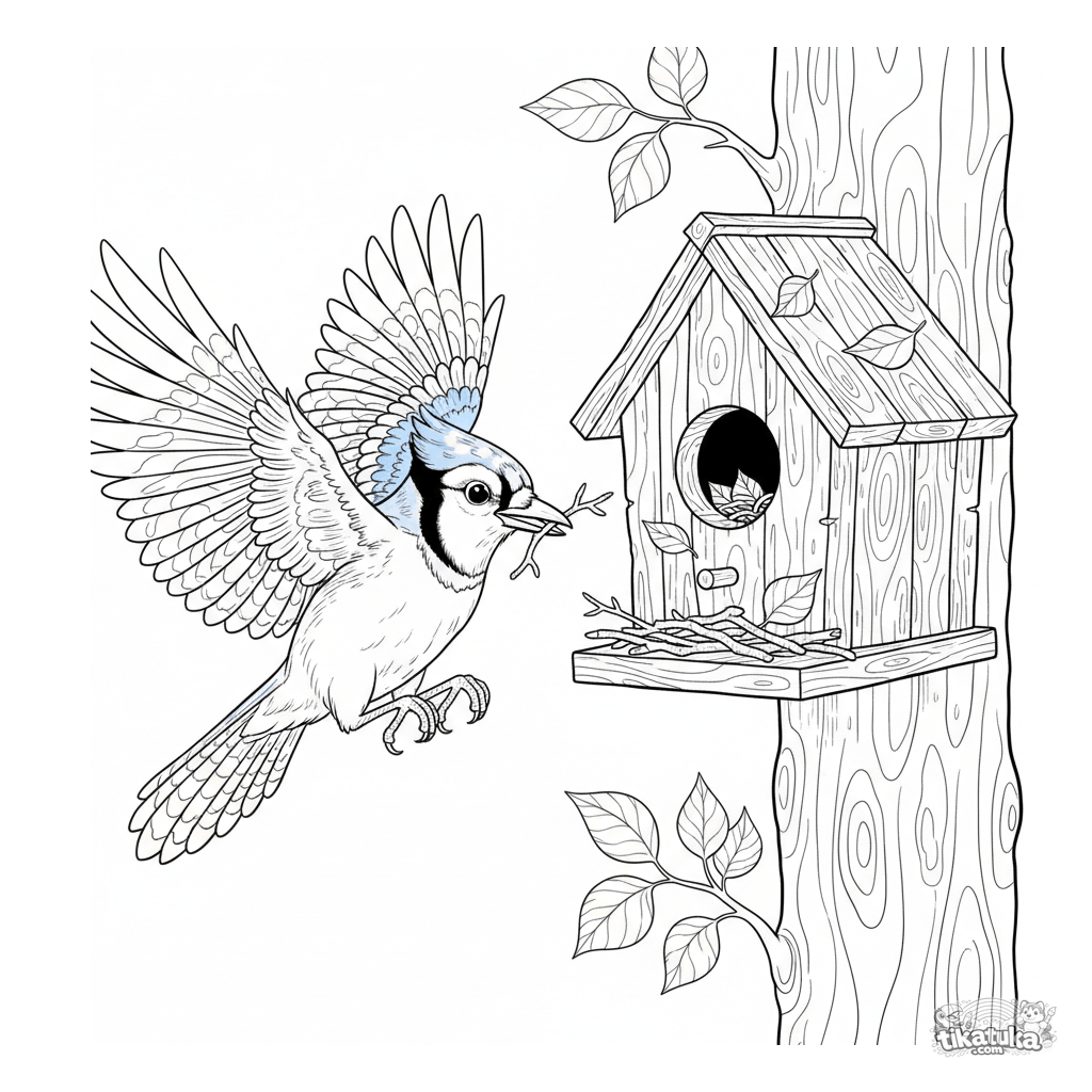 Página para colorear para niños mayores 10-12: un arrendajo en estilo naturalista vuela con una ramita hacia una pajarera de madera en un árbol, construyendo su nido. Ilustración detallada de vuelo y plumas.