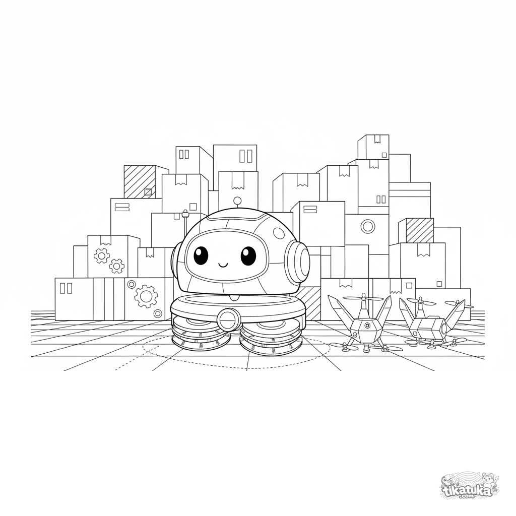 Página para colorear elegante para niños mayores 10-12: un robot limpiador en estilo de plano de ingeniería, ordenando el suelo de un almacén. Líneas geométricas, diseño único.