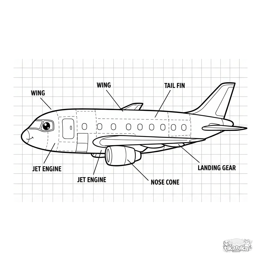 Página para colorear al estilo de un plano de ingeniería de un avión de pasajeros moderno. Cuadrícula, líneas punteadas y etiquetas. Para 7-9 años.