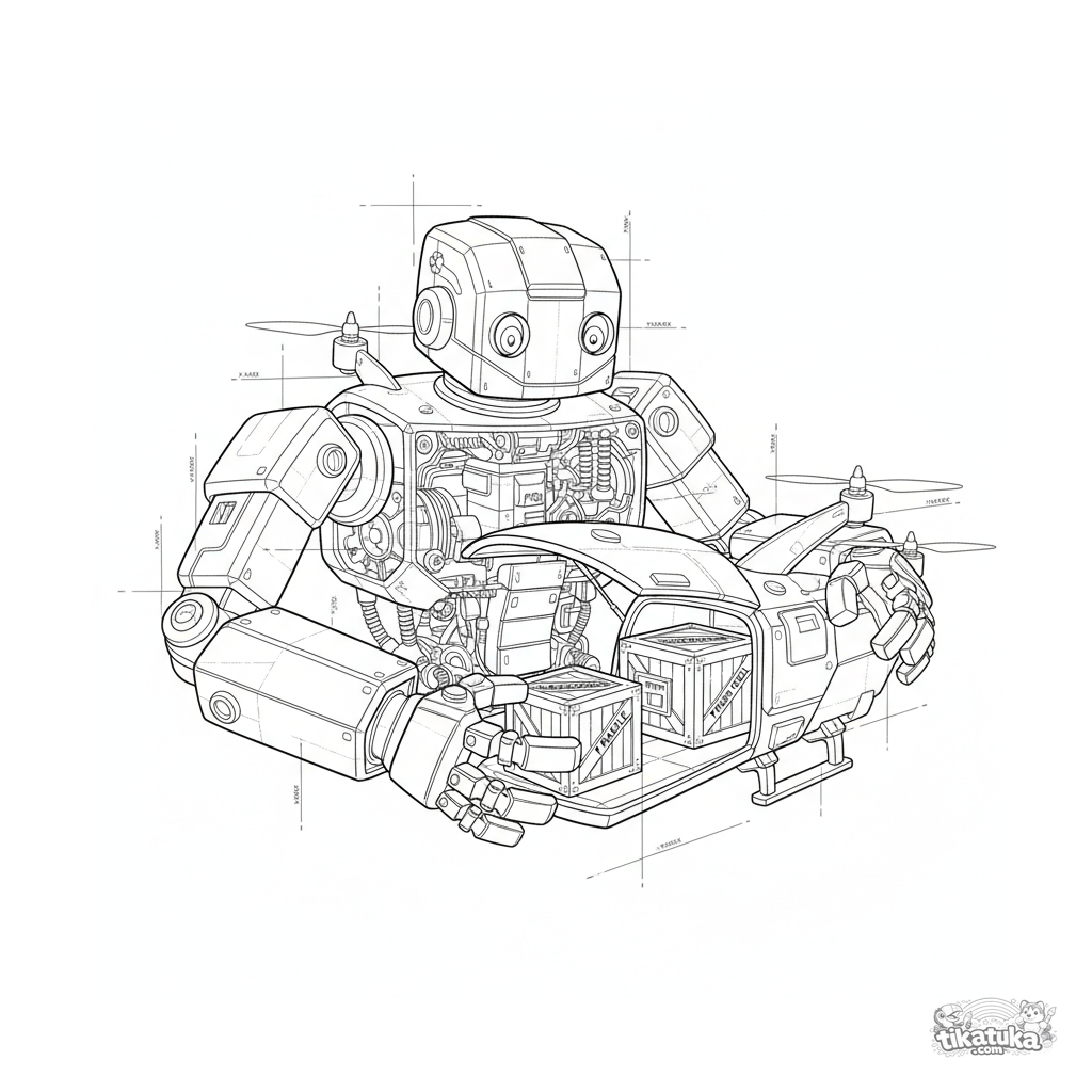 Página compleja para colorear para 10-12 años: un robot con cuerpo transparente, como un plano técnico, descarga cajas de la bodega de un gran dron de transporte volador en un almacén.