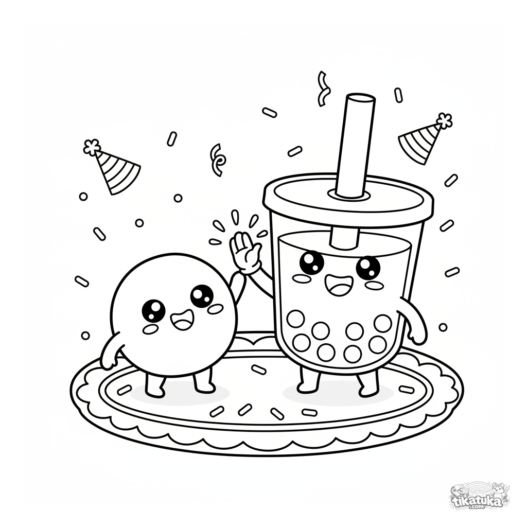 Página para colorear: una taza de boba y un mochi celebran en un plato de postre. Escena divertida con chispas y sombrero de fiesta. Para 4-6 años.
