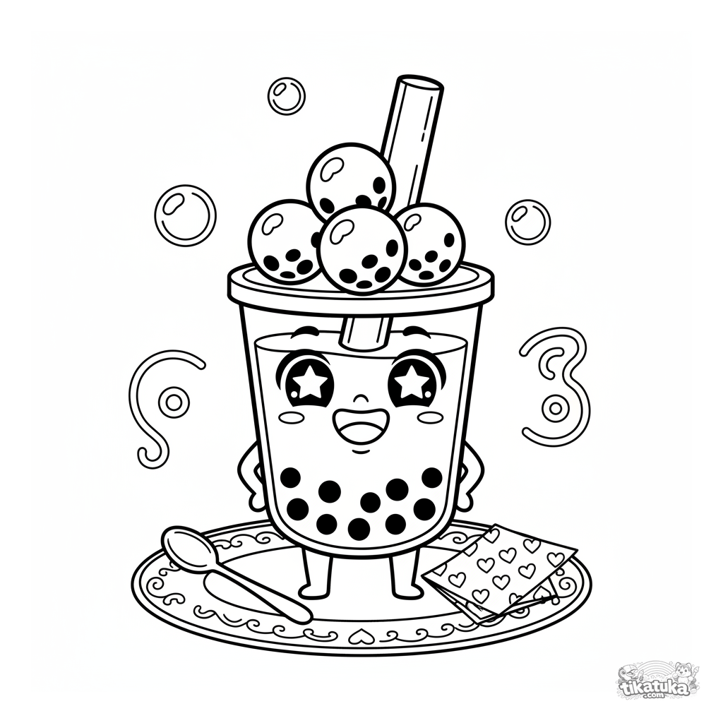 Página para colorear de una taza de boba balanceando perlas en un plato de postre. Para niños de 4 a 6 años. Muestra una taza sonriente con una pajita sosteniendo una pila de perlas de tapioca.