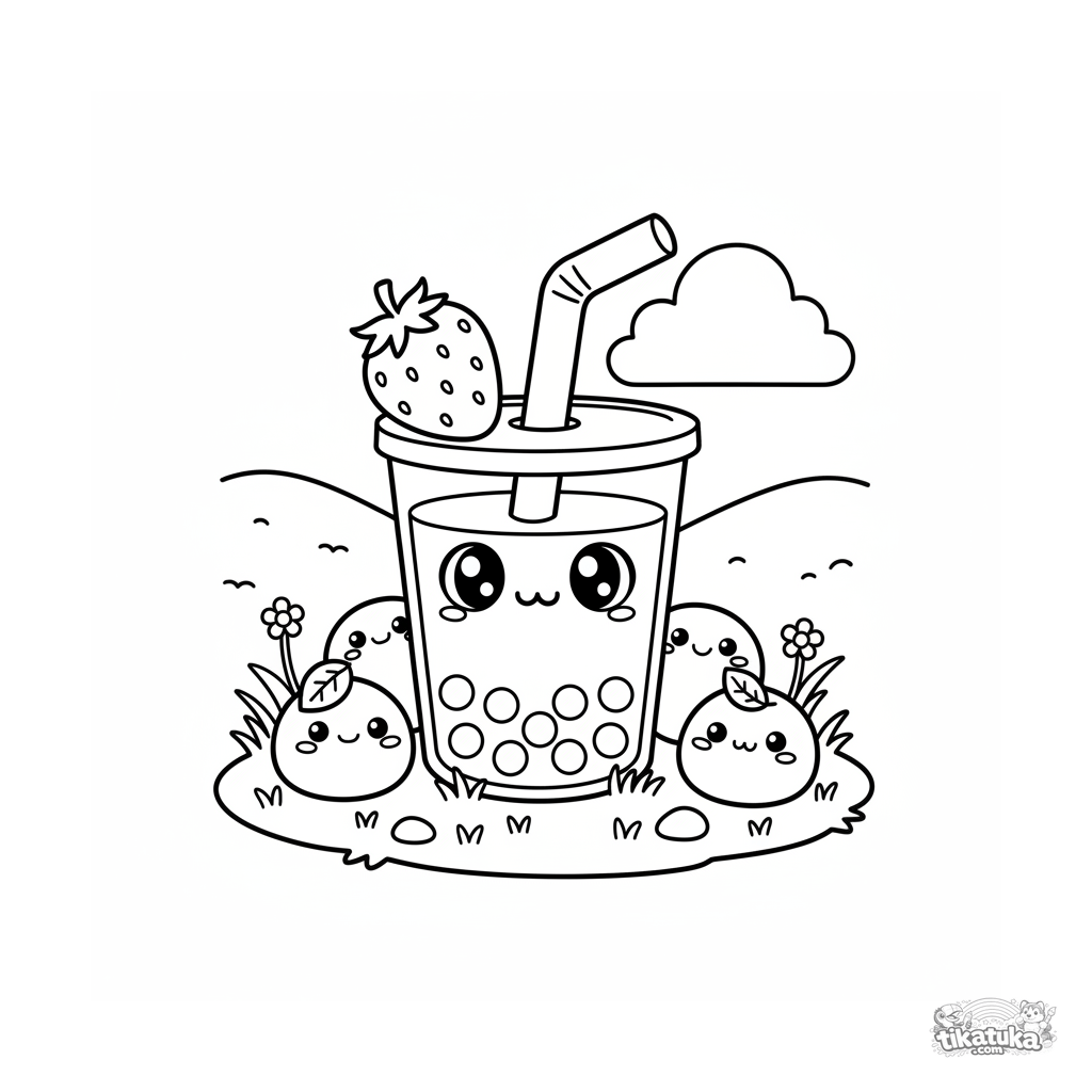 Página para colorear para niños 4-6: una taza de boba juega al escondite tras un mochi de fresa gigante. Escena divertida con detalles.