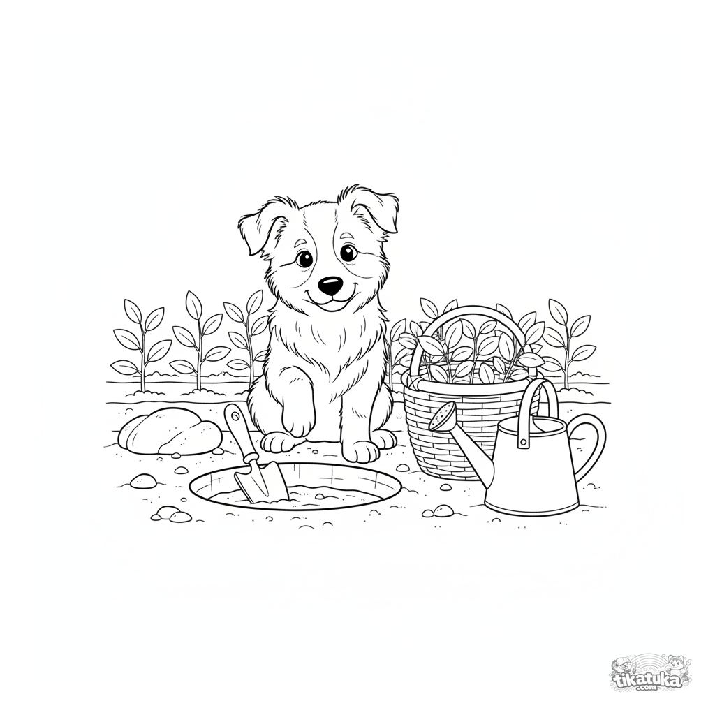 Página para colorear niños: un esponjoso cachorro de border collie ayudando en un jardín primaveral, sentado junto a un hoyo de plantación con herramientas. Contornos claros, escena dulce.