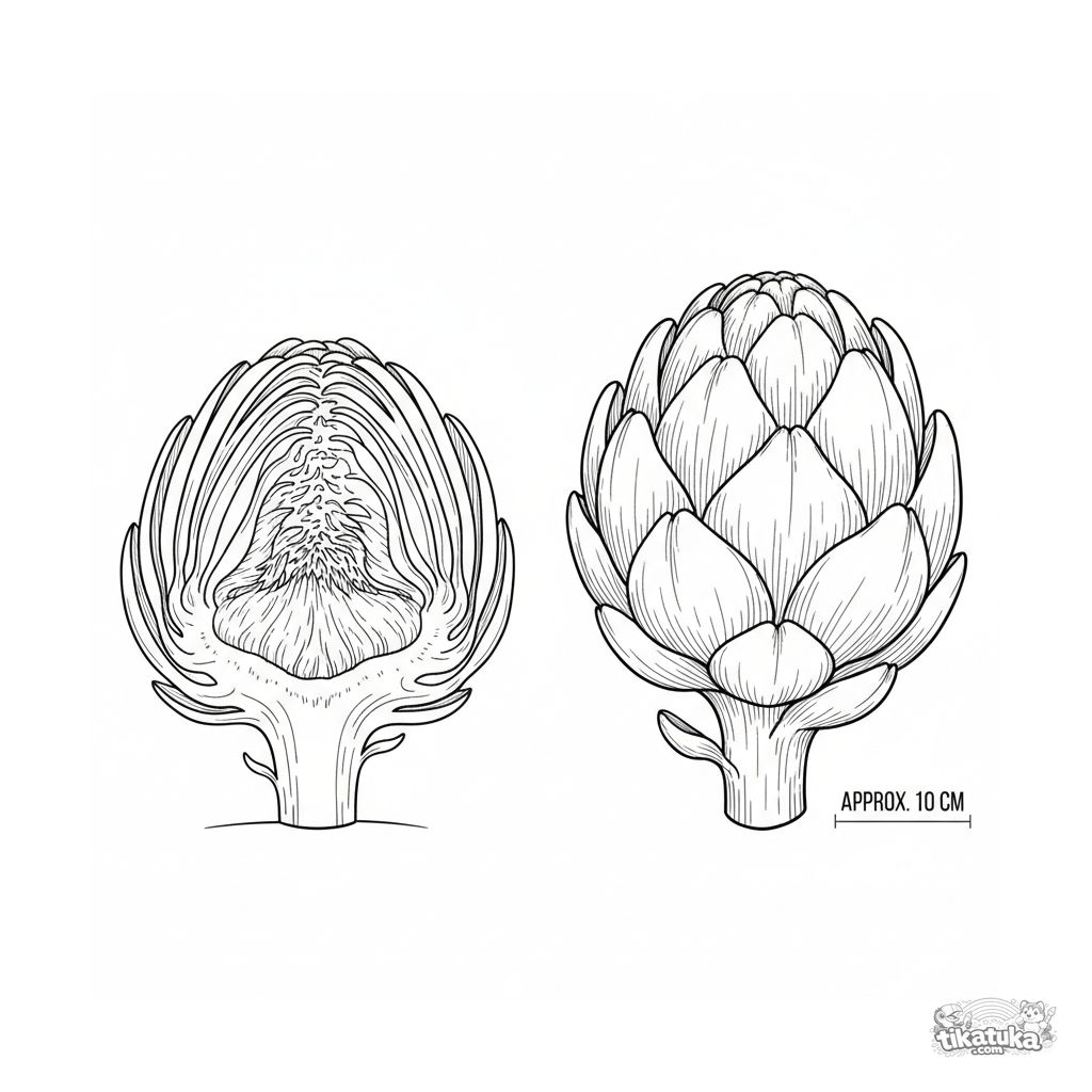 Página para colorear para mayores 10-12: un corte botánico detallado de una alcachofa en estilo guía de campo. Ilustración educativa.