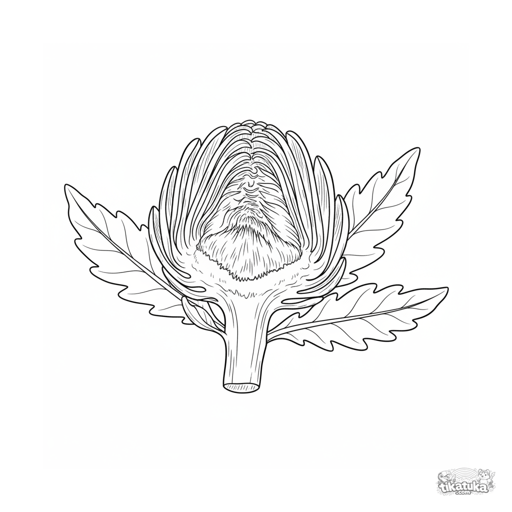 Página para colorear botánica detallada: corte transversal de una alcachofa. Para niños mayores de 10-12 años. Ilustración educativa.