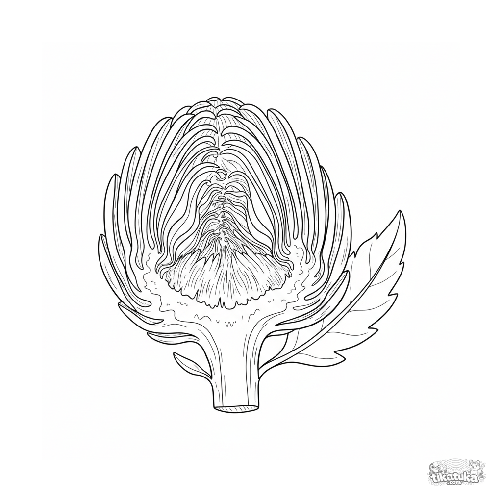 Página para colorear detallada del corte transversal de una alcachofa para 10-12 años. Estilo botánico educativo con fondo limpio.