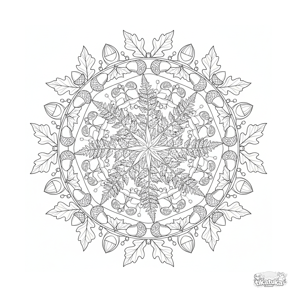 Página para colorear de mandala botánica detallada para 10-12 años. Helechos, vainas de semillas, hiedra, bellotas—patrón simétrico complejo inspirado en la naturaleza, ideal para colorear paciente y detallado.