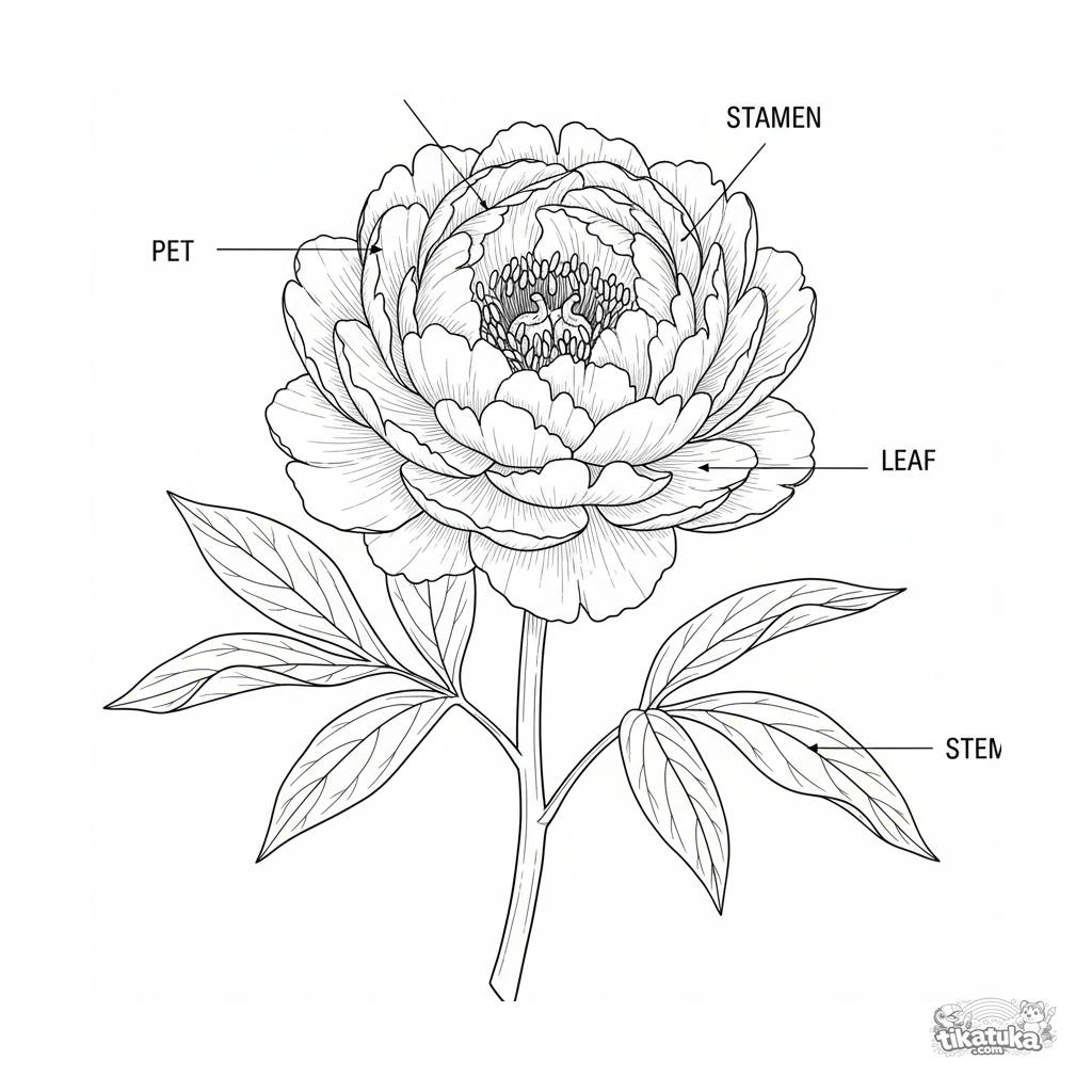 Página para colorear para niños mayores: una ilustración botánica detallada de una peonía con partes de la flor etiquetadas. Alto nivel de detalle, estilo educativo.