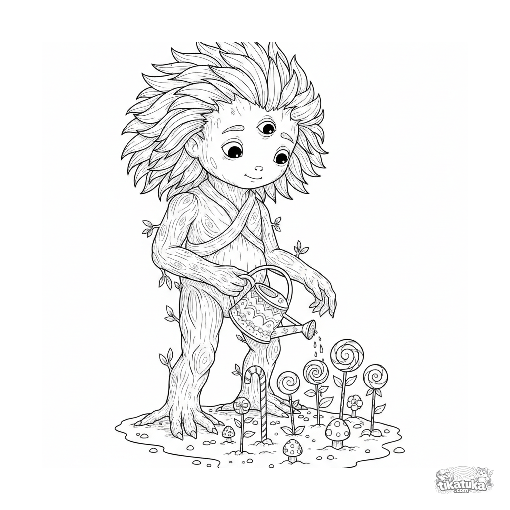 Página para colorear detallada y realista: un monstruo botánico cuidando un jardín de bastones de caramelo en un picnic. Para niños de 10 a 12 años.