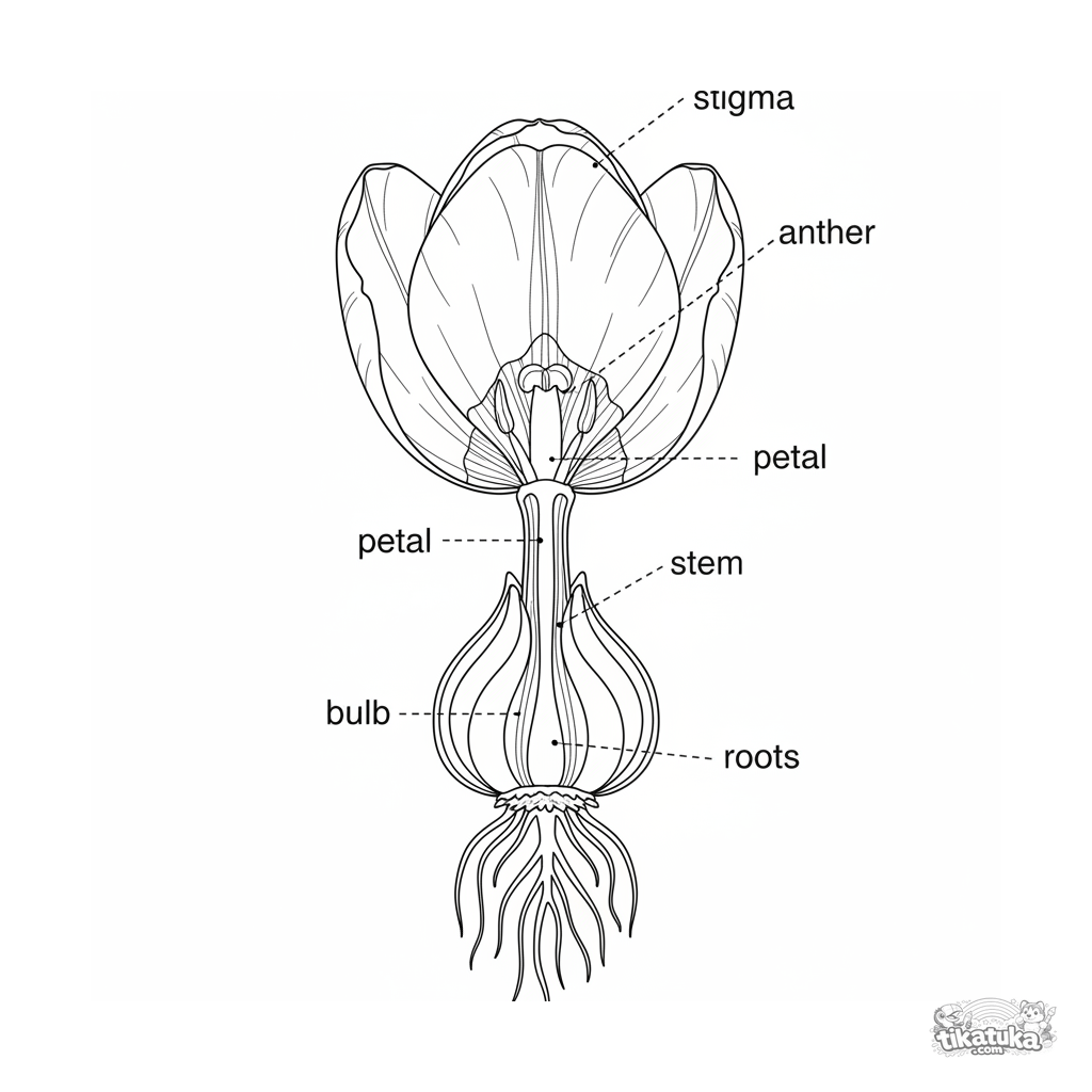 Página educativa para colorear para niños 10-12: un dibujo botánico detallado de un tulipán en corte transversal con partes de la flor etiquetadas. Estilo de atlas científico.