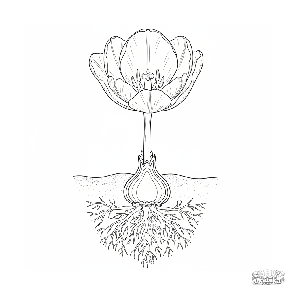 Página para colorear botánica detallada de un tulipán en corte transversal para 10-12 años. Muestra pétalos, estambre, pistilo y sistema radicular bajo la tierra, en estilo científico.
