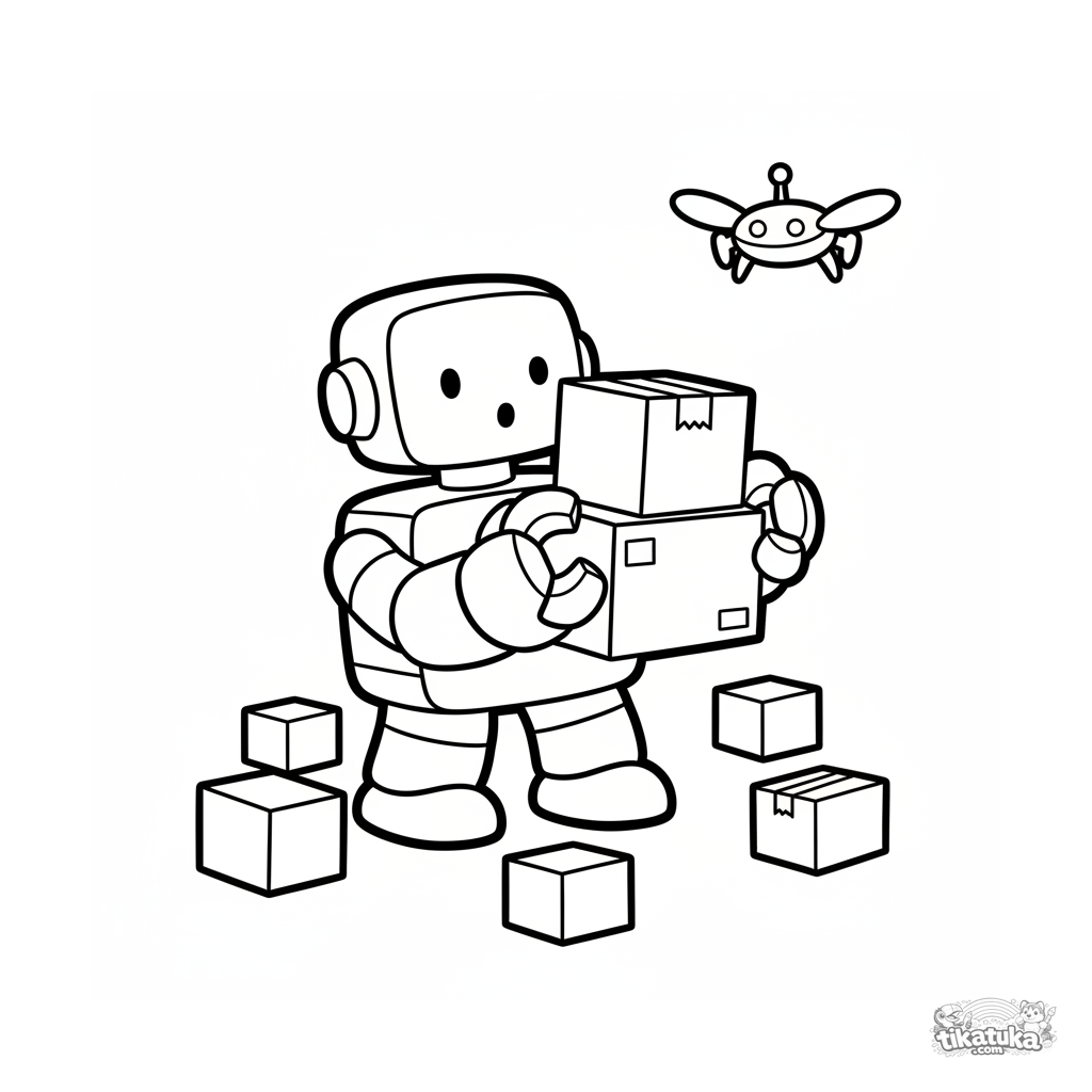 Página para colorear muy simple para niños pequeños 2-3: un robot tipo juguete de madera construye una torre de cajas en un almacén.