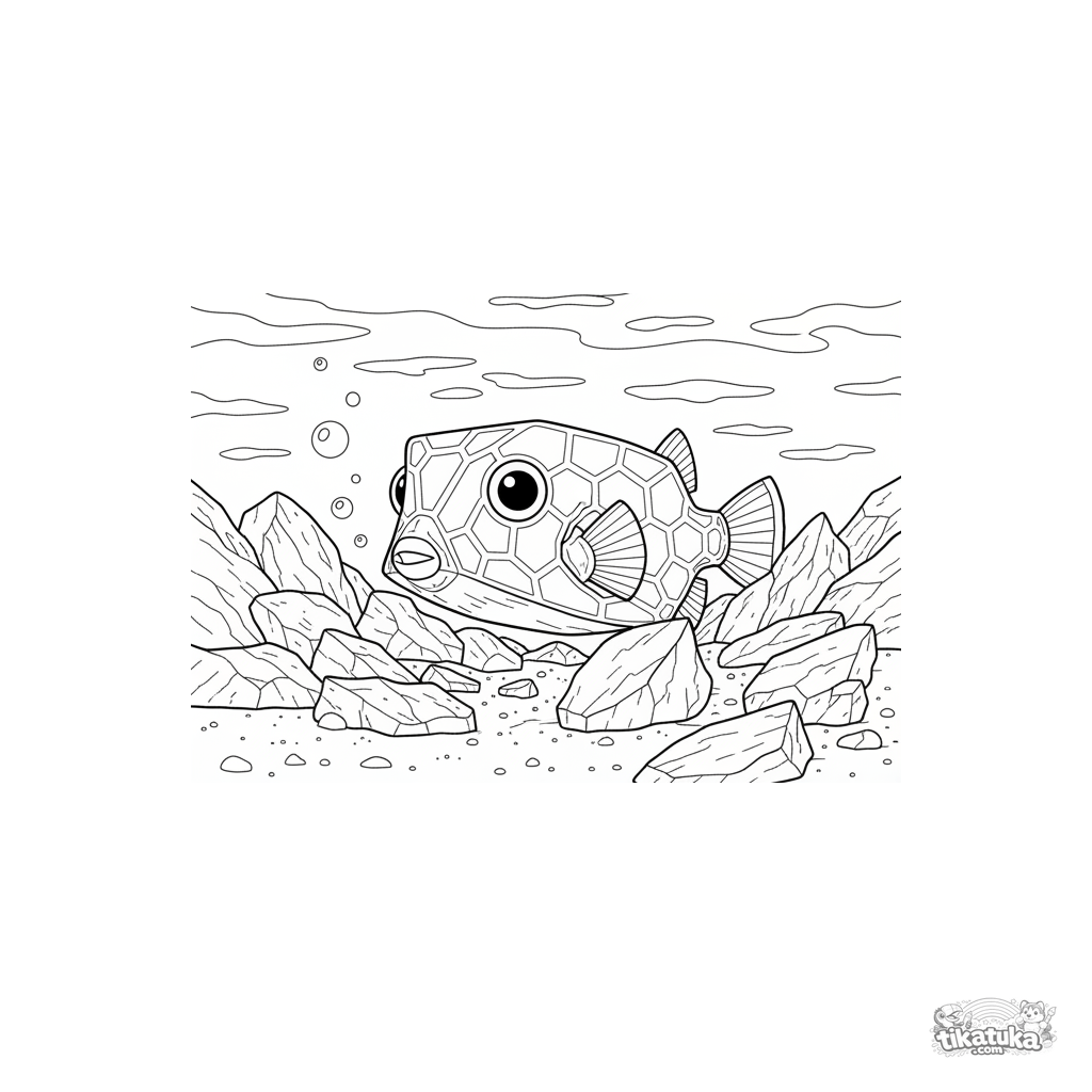 Página para colorear detallada de un pez cofre escondido entre escombros de coral en aguas poco profundas y soleadas. Para niños mayores de 10 a 12 años.
