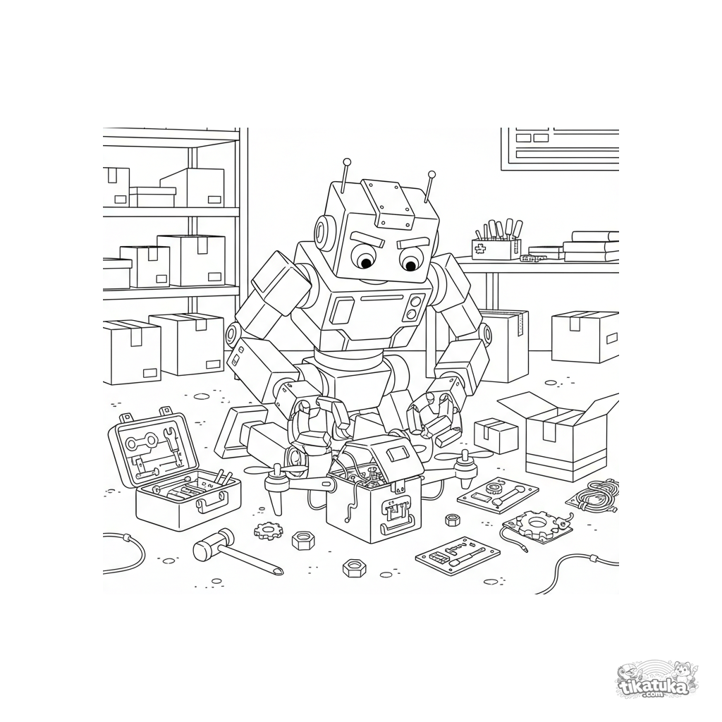 Página para colorear para niños 7-9: un robot mecánico con múltiples brazos herramienta repara un dron en un taller de almacén desordenado, con piezas y herramientas esparcidas.
