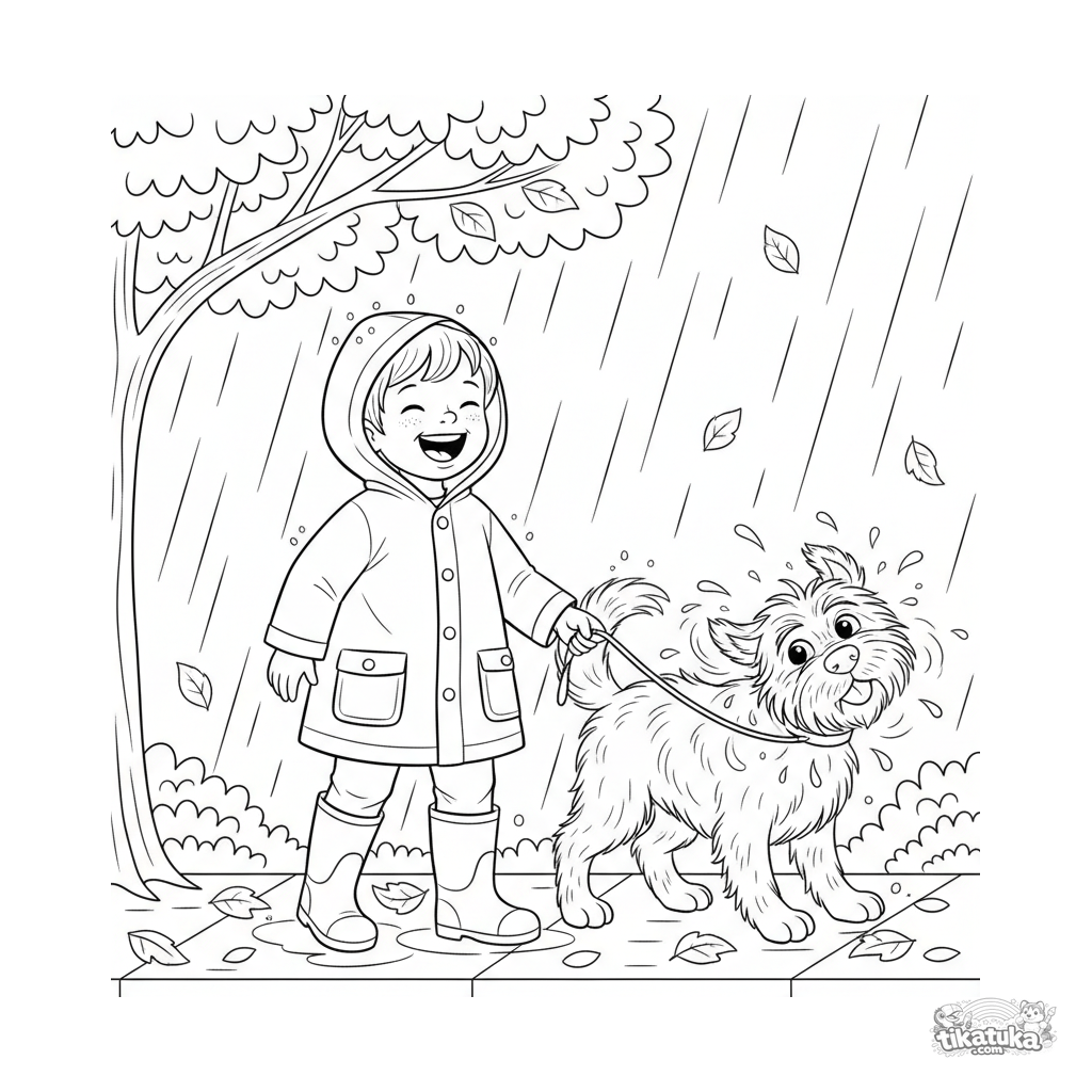 Página para colorear para preadolescentes de 7-9 años: un niño con botas de goma pasea a su perro durante un aguacero de otoño.