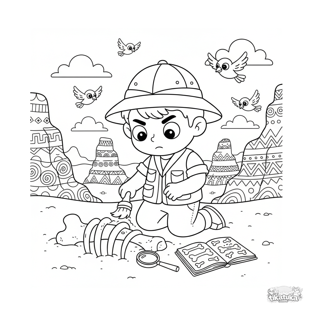 Página para colorear de un niño arqueólogo cepillando un hueso de dinosaurio. Para niños de 6 a 9 años.