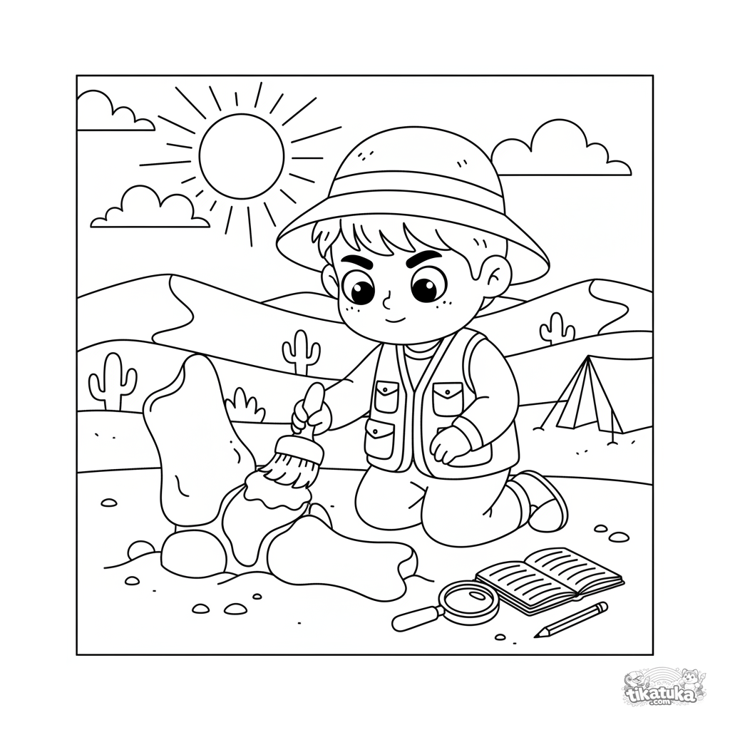 Página para colorear de un niño arqueólogo cepillando un fósil de dinosaurio en un sitio de excavación desértico. Para niños de 5 a 8 años.
