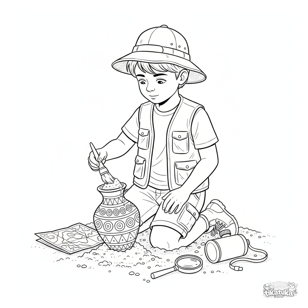 Página para colorear de un niño arqueólogo en una excavación. Para niños de 6 a 9 años. Limpia con cuidado la arena de un jarrón antiguo.