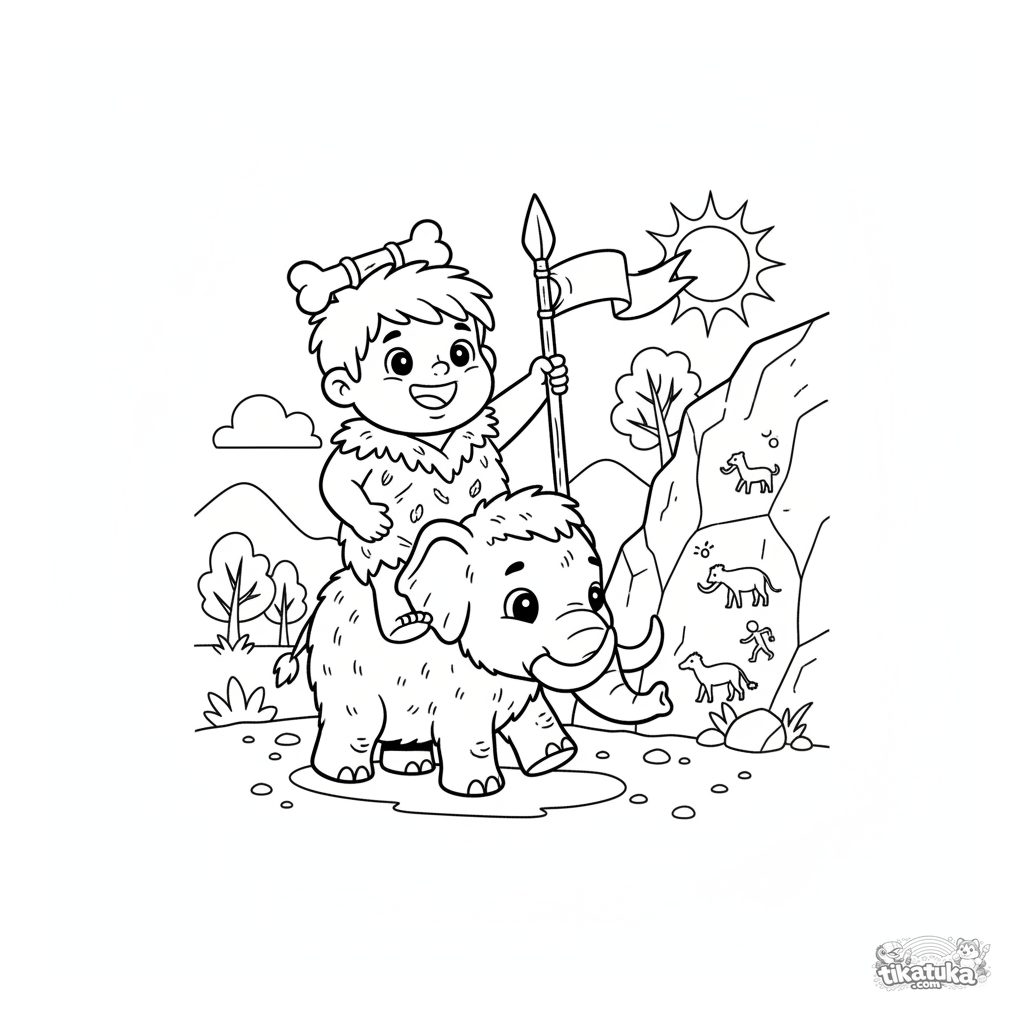 Página para colorear para niños: un niño de la Edad de Piedra monta una cría de mamut junto a una pintura rupestre. Para niños de 5 a 8 años. Escena de aventura prehistórica divertida.