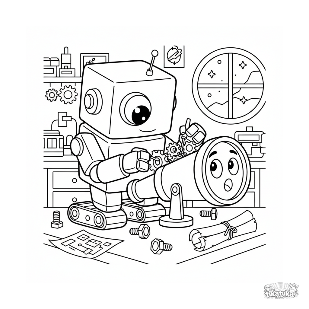 Página para colorear para niños 4-6: un robot asistente amigable en un laboratorio secreto repara un telescopio parlante. Forma cuadrada, orugas, destornillador.