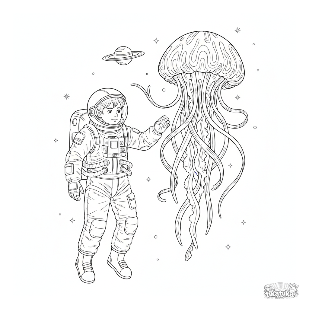 Página para colorear detallada para niños de 7 a 12 años: un astronauta en el espacio profundo encuentra una medusa espacial fantástica y brillante. Traje espacial y fondo cósmico intrincados.