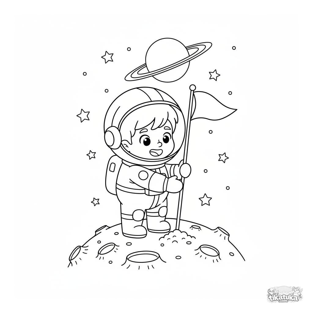 Página para colorear para niños: un niño astronauta planta una bandera en una mini luna con cráteres. Para niños de 4-6 años.