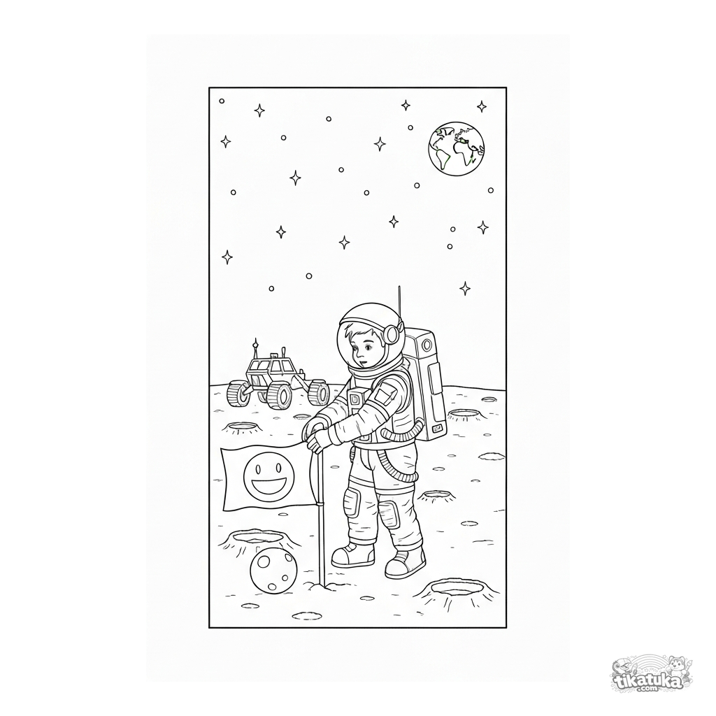Página para colorear para niños: astronauta en la luna. Niño en traje espacial planta bandera cerca de un rover. Para niños de 6 a 9 años, estilo realista.