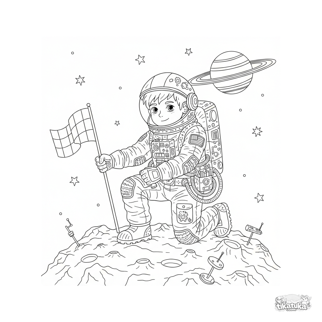 Página para colorear para niños: un joven astronauta planta una bandera en un asteroide. Para 6-9 años. Traje espacial detallado.