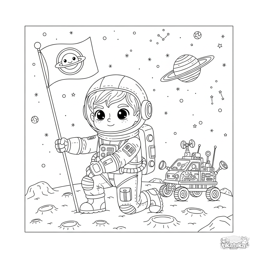 Página para colorear de un niño astronauta plantando una bandera en la superficie craterizada de la luna. Para niños de 6 a 9 años.