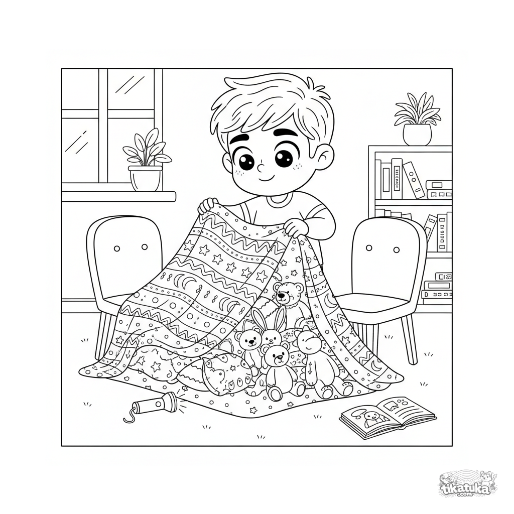 Página para colorear de un niño construyendo un fuerte acogedor con mantas y almohadas en la sala. Para niños de 4 a 6 años.