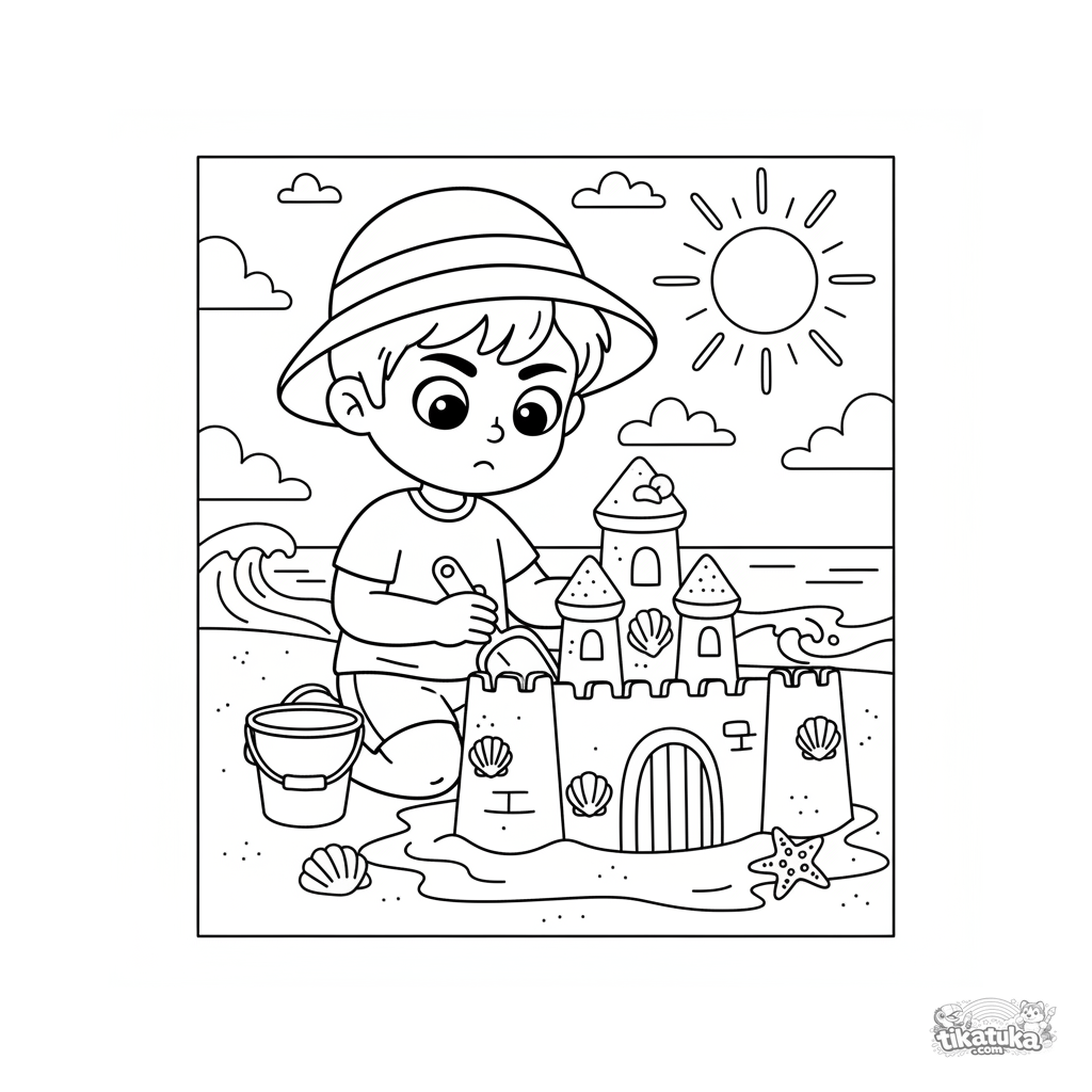 Página para colorear para niños: un niño construye un castillo de arena en la playa. Para niños de 4 a 6 años. Cuerpo completo visible, márgenes amplios, escenas de verano.