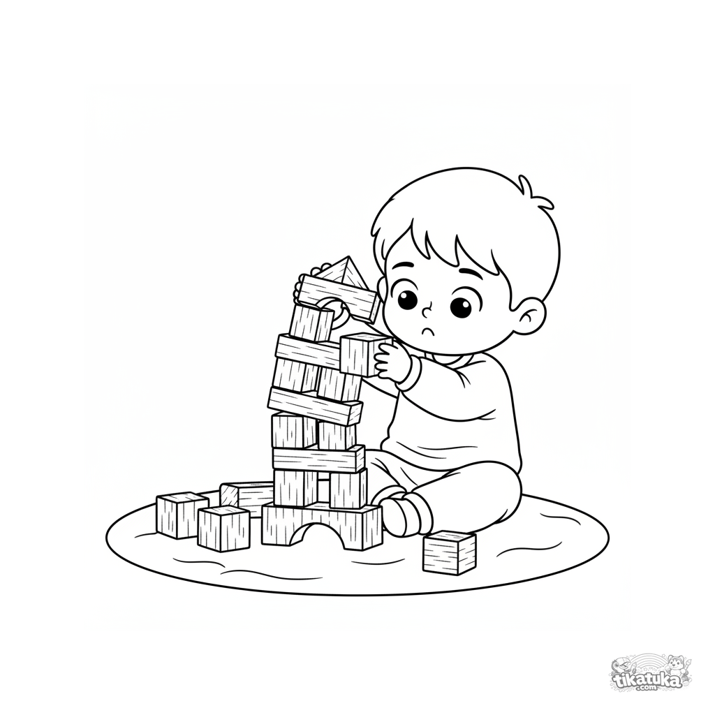 Página para colorear para niños pequeños 2-3: un niño construye una torre con bloques grandes. Formas grandes y simples, bajo detalle, perfecto para primeros crayones.