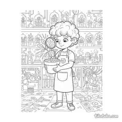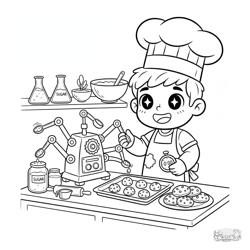 Página para colorear para niños 4-6: un alegre niño chef en un laboratorio prueba su invento, una máquina automática para hacer galletas. Escena brillante y clara.