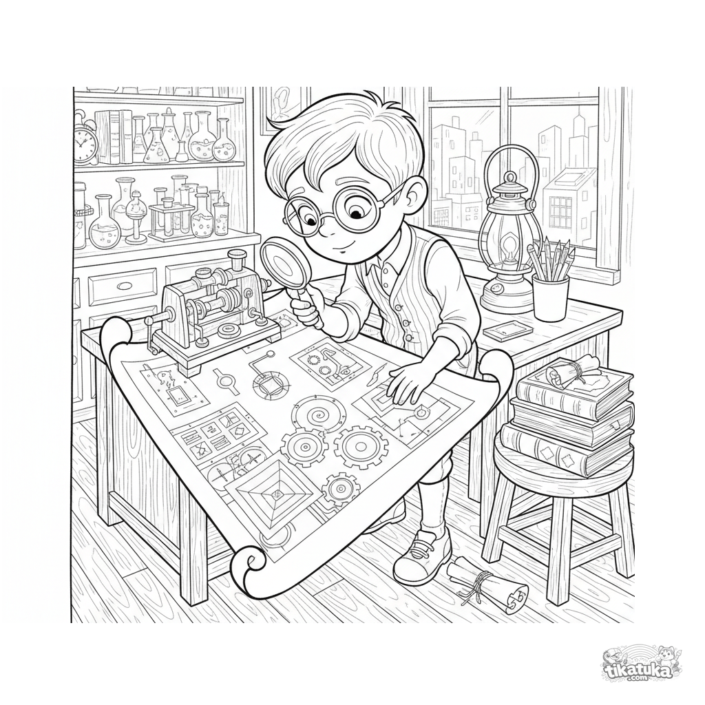 Página para colorear compleja para niños 10-12: un niño estudia un plano antiguo con símbolos misteriosos en el laboratorio.