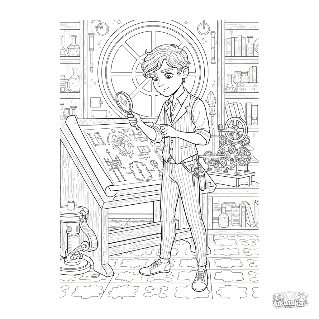 Página para colorear compleja para niños 10-12 años: un niño en un laboratorio secreto estudia un plano de un mecanismo antiguo. Escena detallada en estilo grabado antiguo.