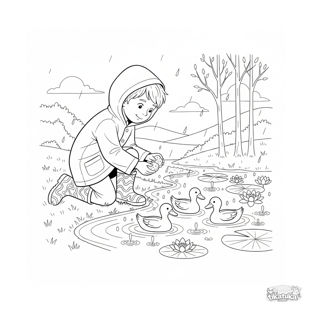 Página para colorear para niños de 7-9 años: un niño con impermeable alimenta patos en un estanque otoñal bajo la lluvia. Patos, ondulaciones, detalles realistas.