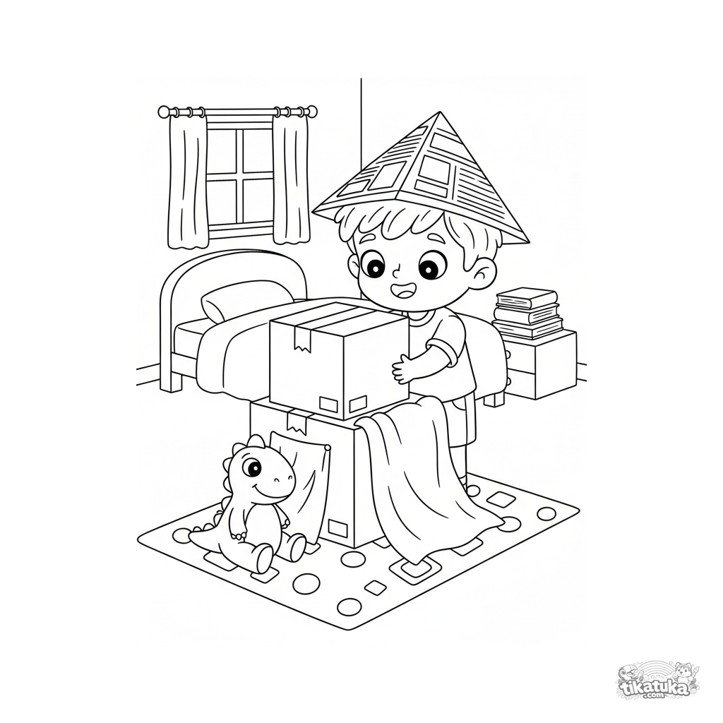 Página para colorear de un niño construyendo un fuerte imaginativo con cajas de cartón en su habitación. Para niños de 4 a 6 años.