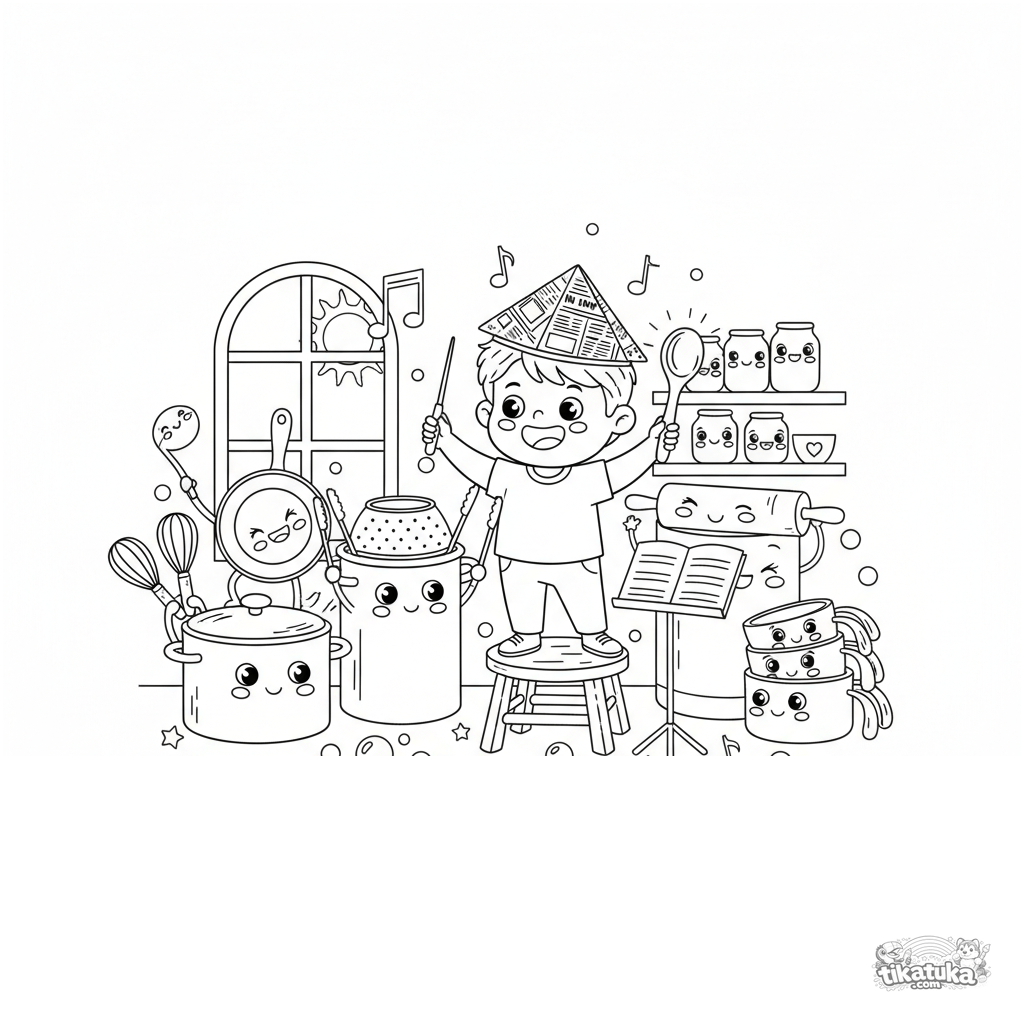 Página para colorear de un niño con un sombrero de periódico dirigiendo una orquesta alegre de ollas y utensilios de cocina. Para niños de 5 a 8 años.