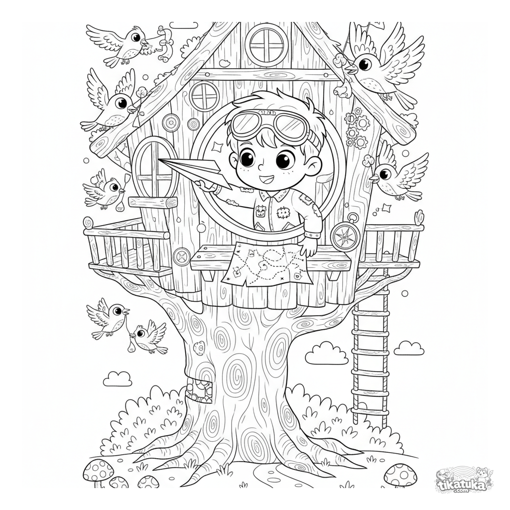 Página para colorear de un niño lanzando un avión de papel desde una casa del árbol. Para niños de 6 a 9 años. Incluye gafas de aviador, mapa y brújula.