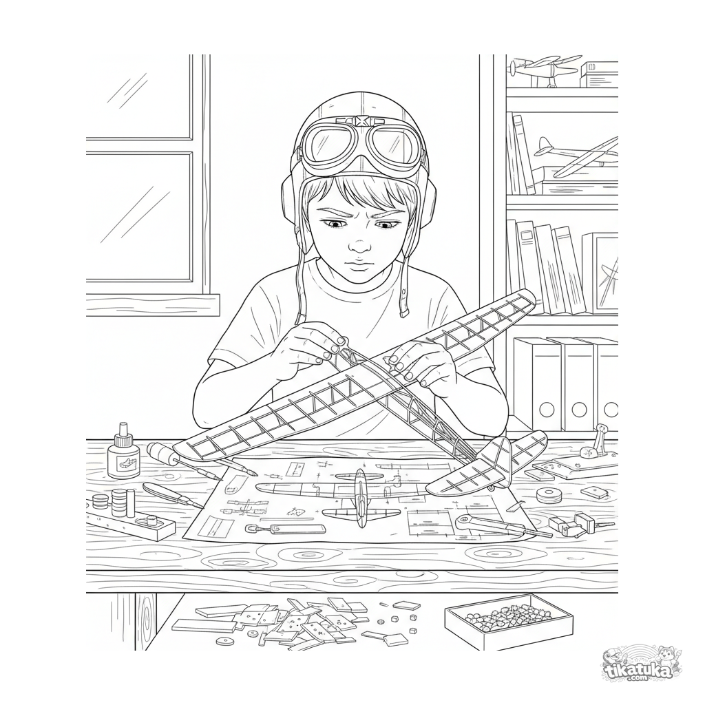Página para colorear para niños de 7-12 años: un niño con casco de aviador arma un planeador de madera de balsa en un banco de trabajo. Escena detallada con planos.