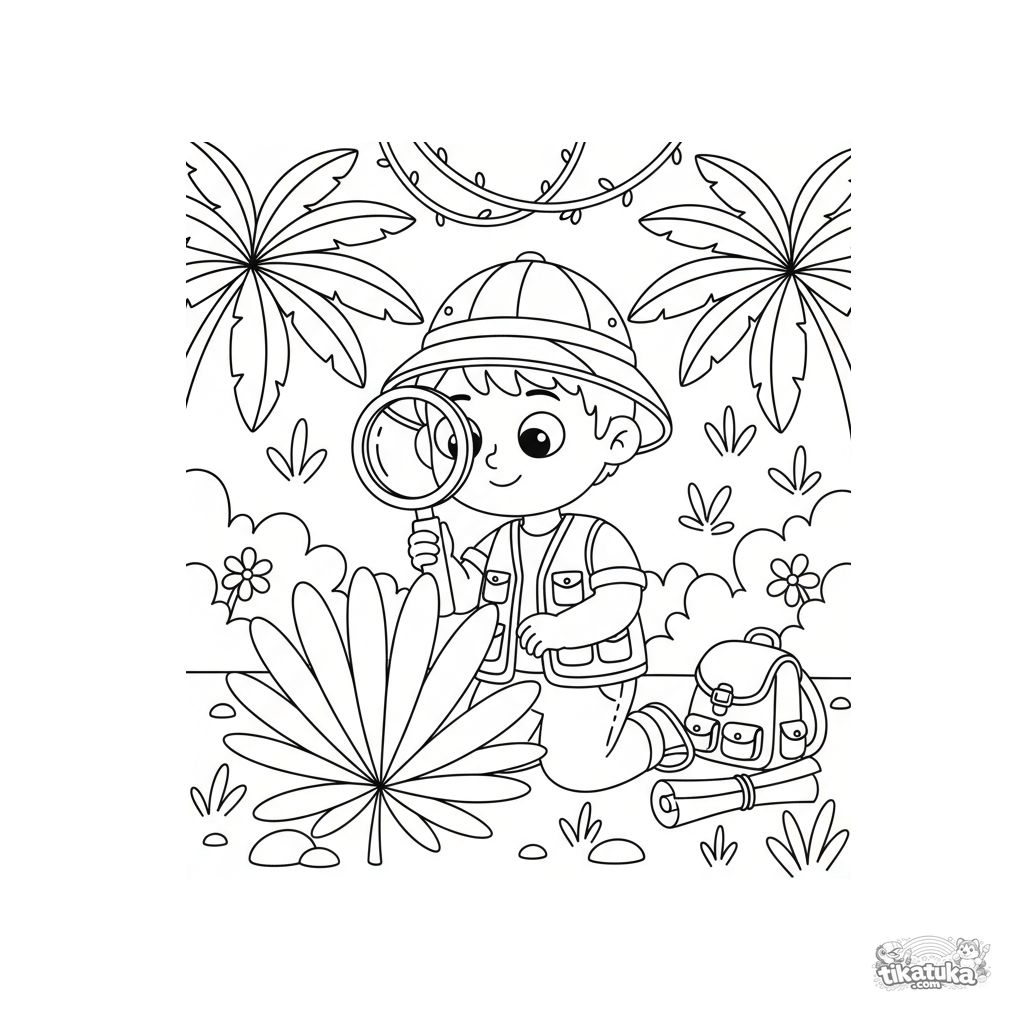 Página para colorear de un niño explorador curioso usando una lupa para estudiar una hoja gigante en la jungla. Para niños de 3 a 6 años.
