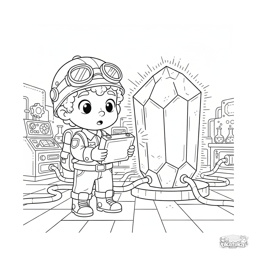 Página para colorear para niños 7-9: un niño explorador en un laboratorio secreto estudia con cautela un núcleo de poder de cristal gigante y pulsante.
