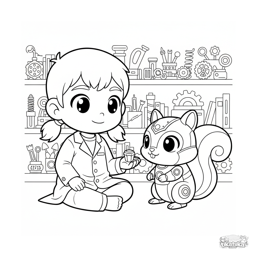 Página para colorear para niños 4-6: un niño inventor alimenta a su lindo robot ardilla mascota en el laboratorio.