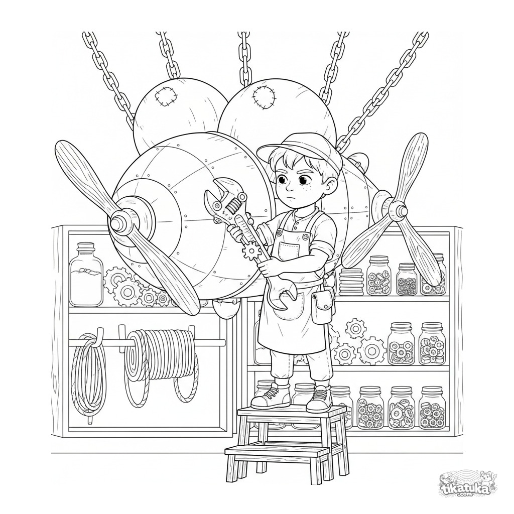 Página para colorear detallada para niños 10-12: un niño inventor repara un artefacto volador complejo en su taller.