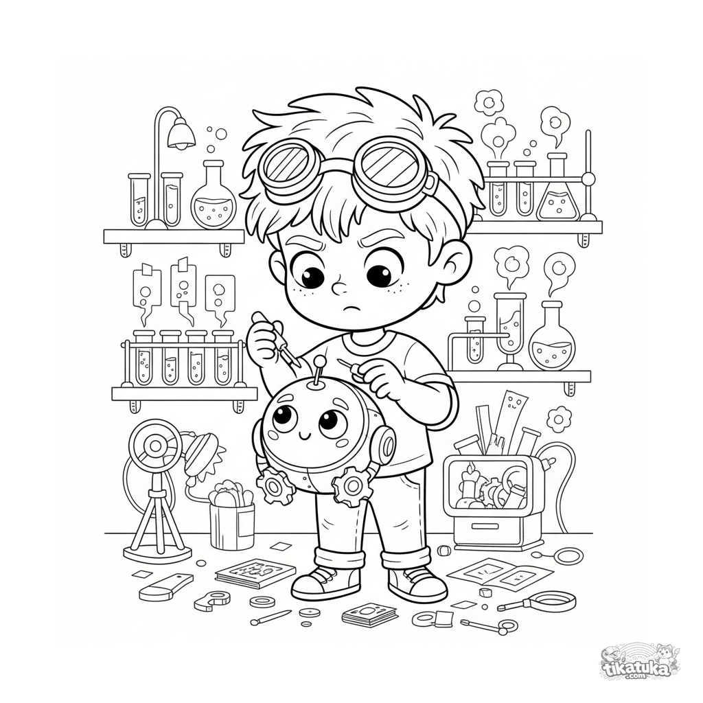 Página para colorear para niños de 4-6 años: un niño inventor y su robot mascota de engranajes en un laboratorio secreto.