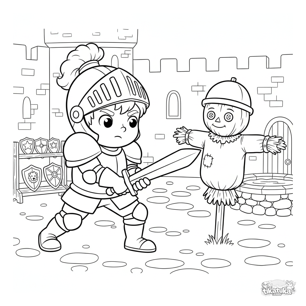 Página para colorear de un niño caballero practicando con una espada de madera contra un espantapájaros de paja en el patio de un castillo. Para niños de 5 a 8 años. Escena con armadura y escudos de práctica.