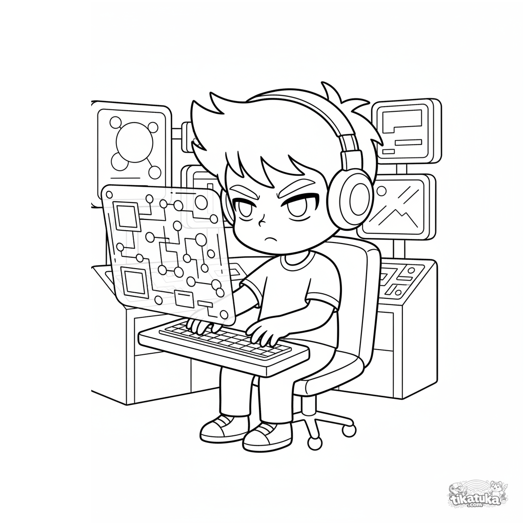 Página para colorear para niños de 7-9 años: un niño programador trabaja con una interfaz holográfica en un laboratorio secreto.