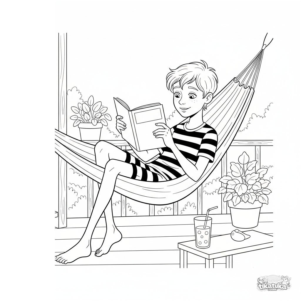 Página para colorear para niños 4-6: un niño descansando en una hamaca en el porche de una dacha, leyendo un cómic. Un vaso de limonada está cerca.